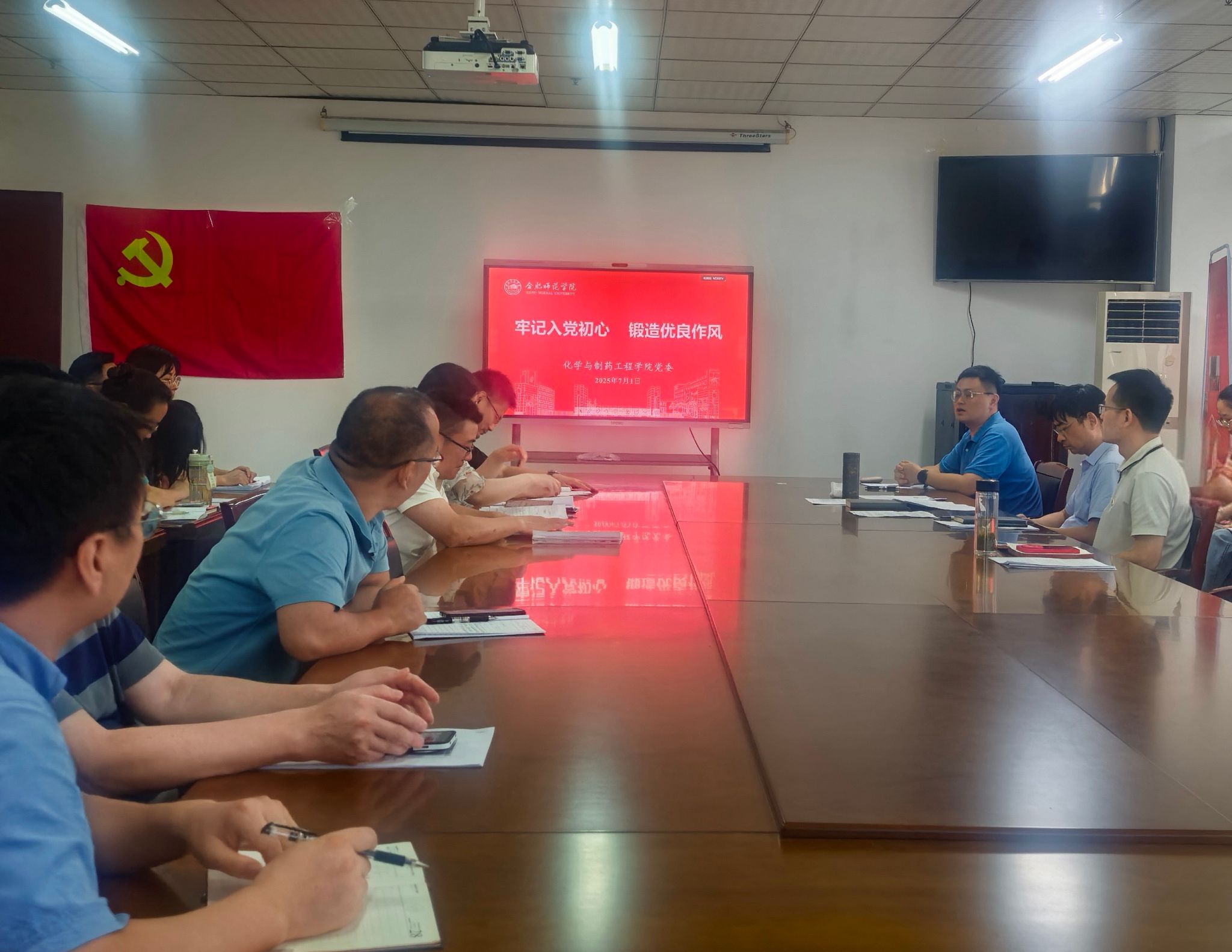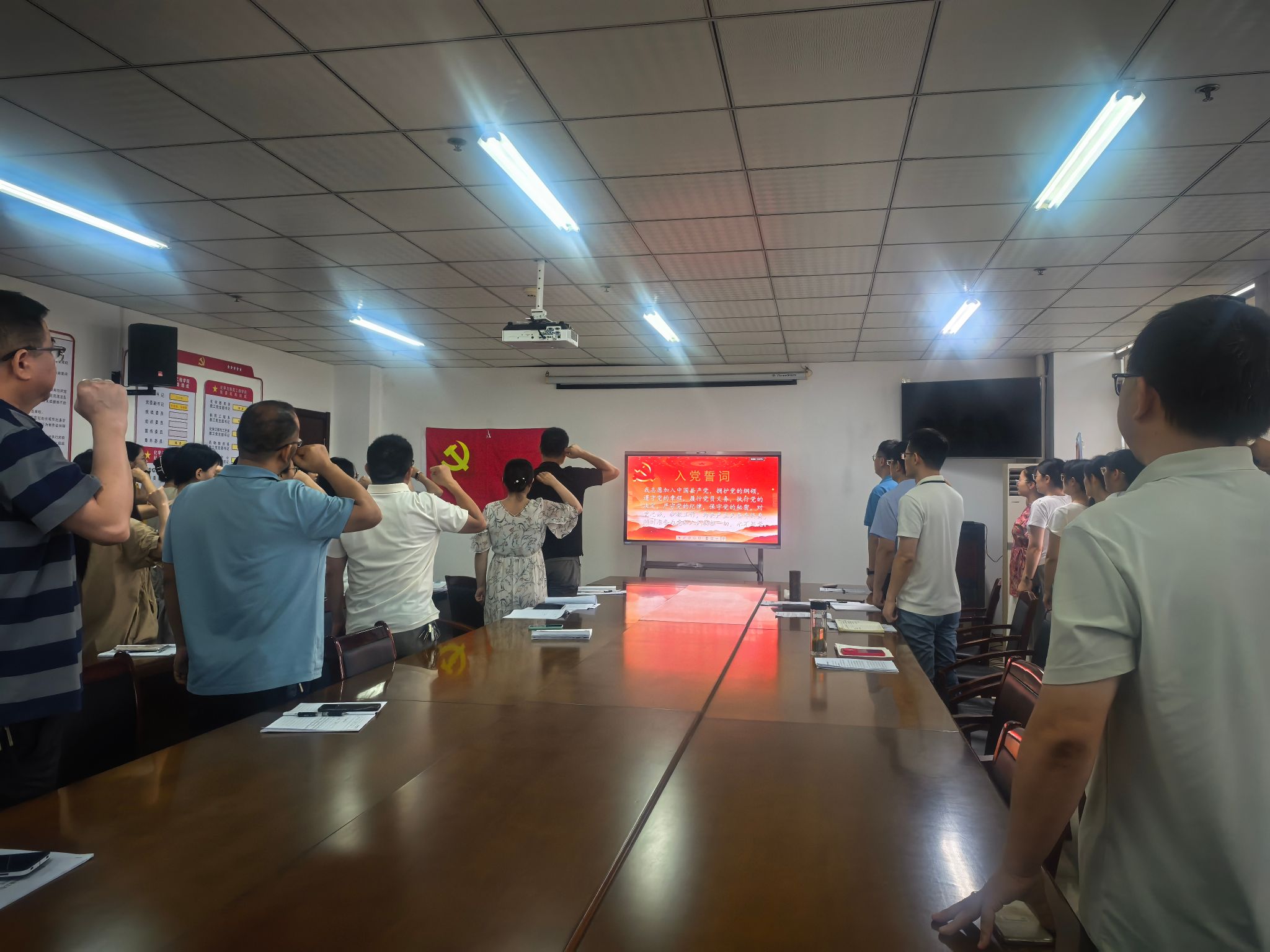 观影结束后,全体党员庄严肃立,面向鲜红的党旗,高举右拳,重温入党誓词。这一刻,每一位党员仿佛回到了自己最初加入党组织的光荣时刻,字字千钧的承诺再次叩击灵魂深处。重温誓词,不仅是对入党初心的深情回望,更是对使命担当的庄严宣示,提醒着每一位党员时刻牢记自己的身份与责任,永葆对党的忠诚与热爱。