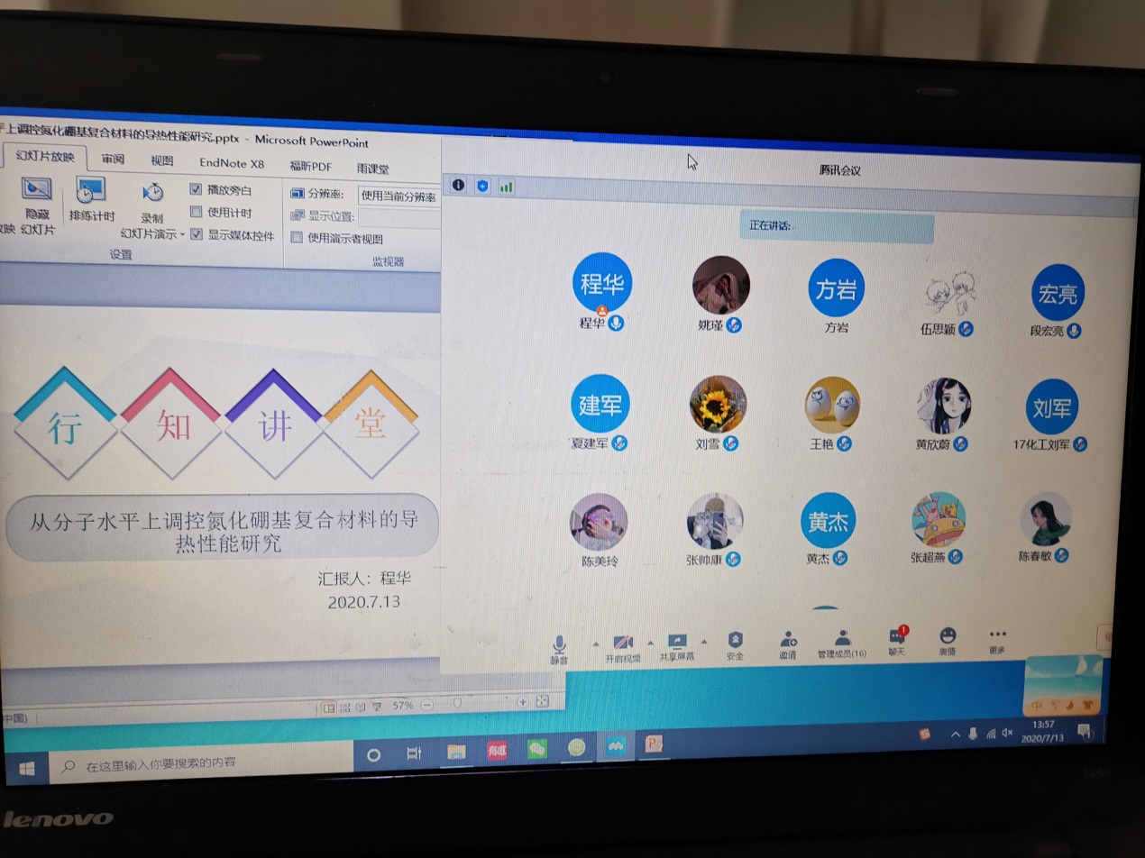 本网讯 7月13日,化学与化学工程学院程华老师在腾讯会议线上平台做了题为“从分子水平上调控氮化硼基复合材料的导热性能研究”的学术报告,化学工程与工艺专业学生聆听了学术报告。