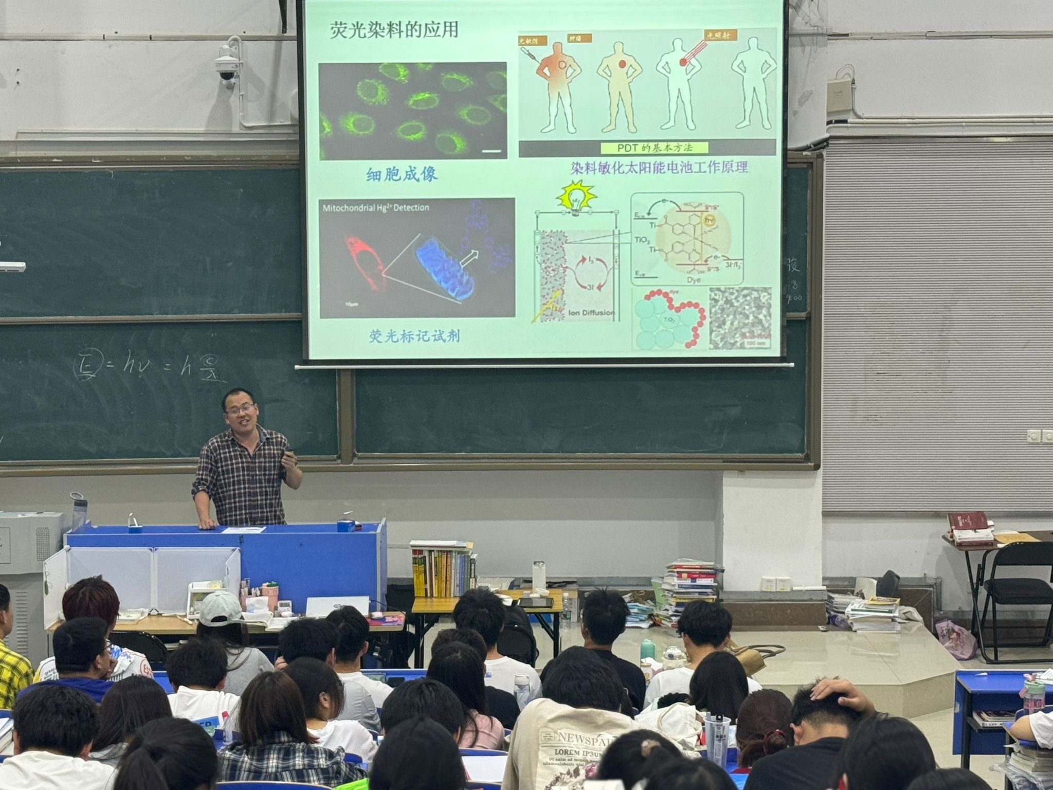 5月8日晚,91久久精品无码一级毛片在锦绣校区逸夫楼西阶1教室举行了一场题为“基于BODIPY分子的有机荧光染料研究”的行知讲座。本场报告由91久久精品无码一级毛片王骏老师主讲,化学专业部分学生聆听了讲座。