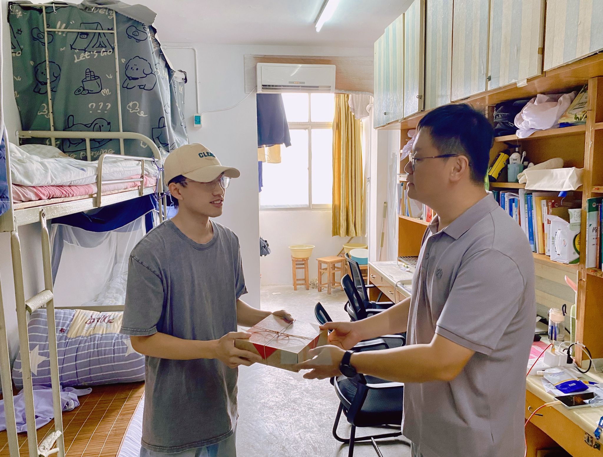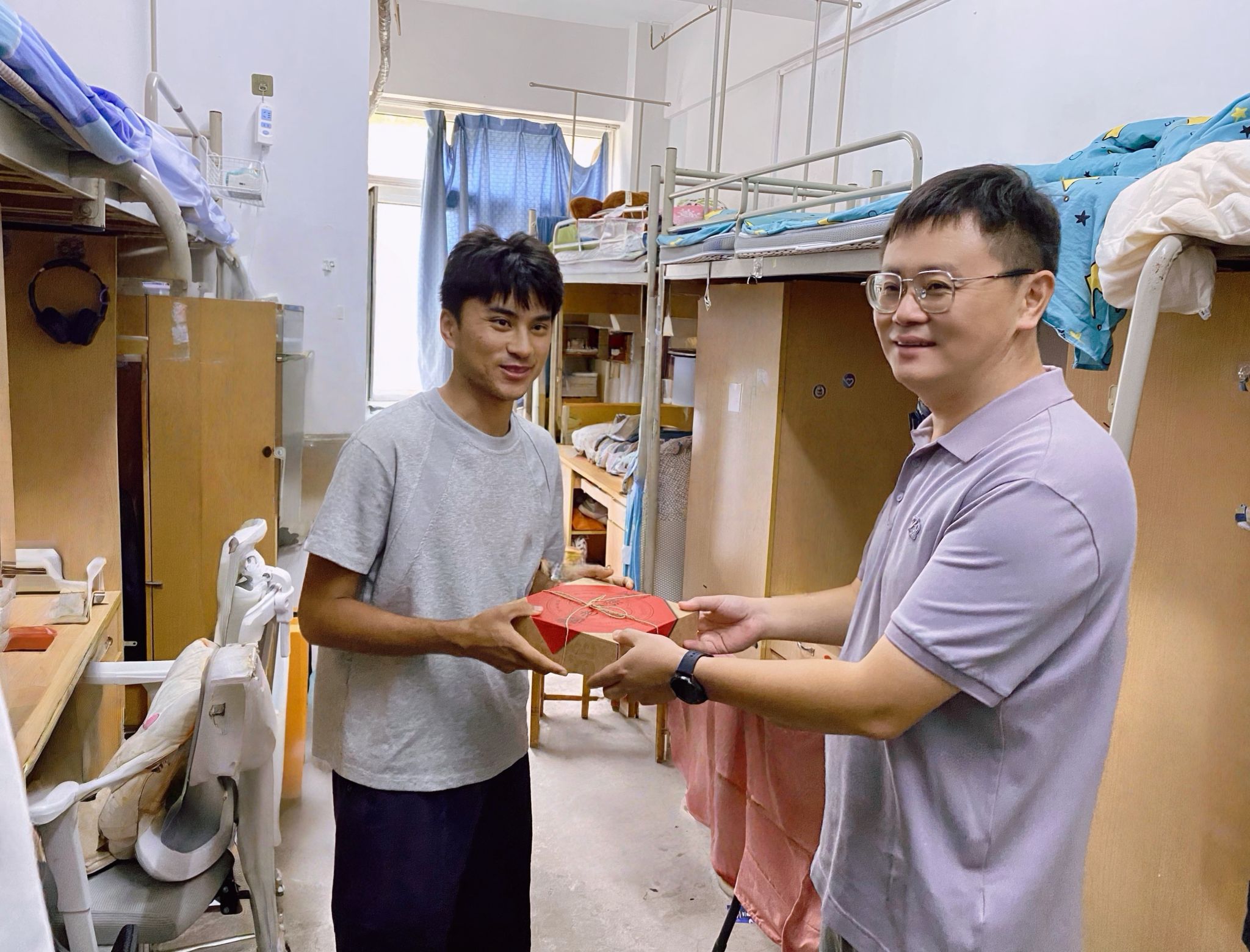 走访过程中,学院领导、老师与同学们进行了亲切交流。“家乡是哪里?”“学习生活上有没有什么困难?”“假期有什么安排?”……一句句贴心的问候,瞬间拉近了师生间的距离。每到一间宿舍,欢声笑语不断,洋溢着热烈而温馨的节日氛围。收到月饼的同学们惊喜不已,纷纷表示这份“专属”礼物让他们倍感温暖。领导们亲切关怀同学们在校的学习和生活情况,认真倾听大家的需求与建议,并叮嘱同学们在欢度假期的同时,要注意人身财产安全,合理安排作息时间,做到劳逸结合。